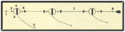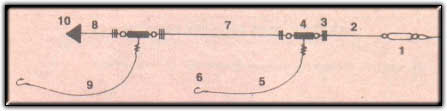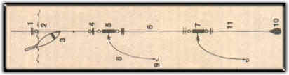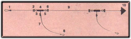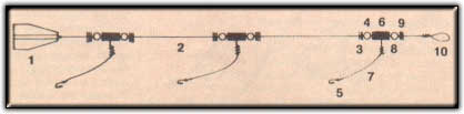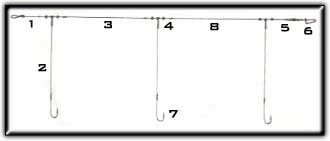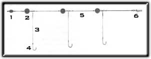 5. Brazoladas de nailon 0,40 de un largo de 40 a 60 cm; 6. Anzuelos
