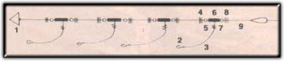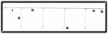 reten de carnada N° 6 de paleta; 4. Anzuelo robador N° 3/0 ó 4/0; 5.