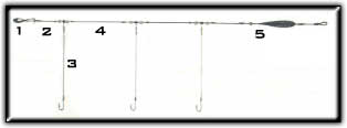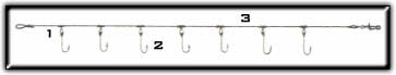 Rotor mandale N° 3; 2. Brazolada del 0,40 y 45 cm de longitud; 3. Anzuelos