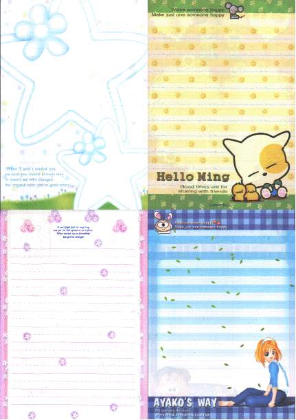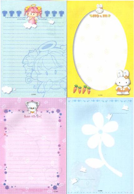 Product Code: writg02r Price: $5.00 This writing pad contains 32 differently designed writing sheets. All writing sheets are cheerful looking with no repetition. Does not come with envelopes. For sample images of the writing sheets, click on the links below. Made in Korea |