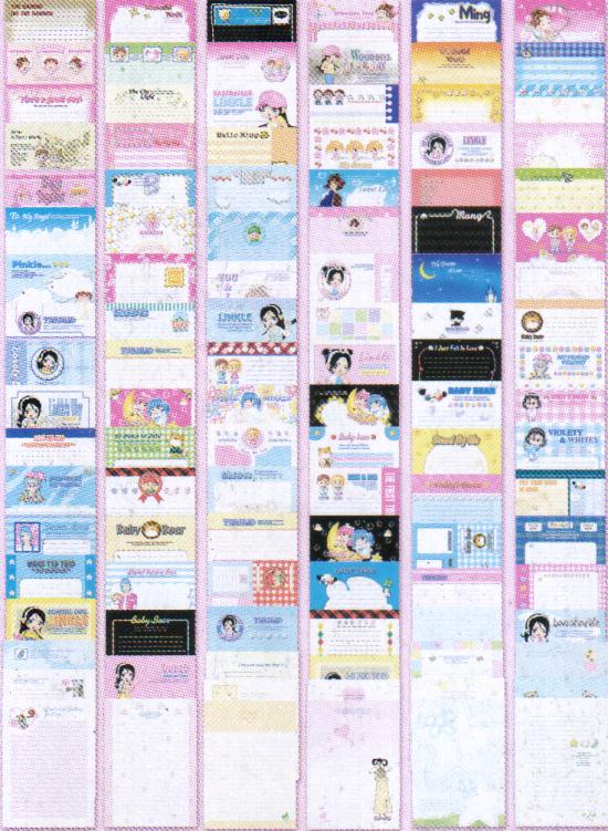 Product Code: writg01r Price: $8.00 This writing pad contains 100 differently designed writing sheets. All writing sheets are cheerful looking with no repetition. Does not come with envelopes. For sample images of the writing sheets, click on the links below. Made in Korea |