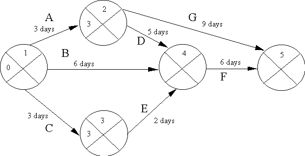 The diagram consists of a number of circles, representing events within the development lifecycle, such as the start or completion of a task, and lines, which represent the tasks themselves. Each task is additionally labelled by its time duration. Thus the task between events 4 & 5 is planned to take 3 time units. The primary benefit is the identification of the critical path.