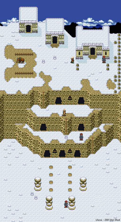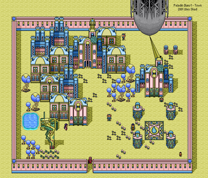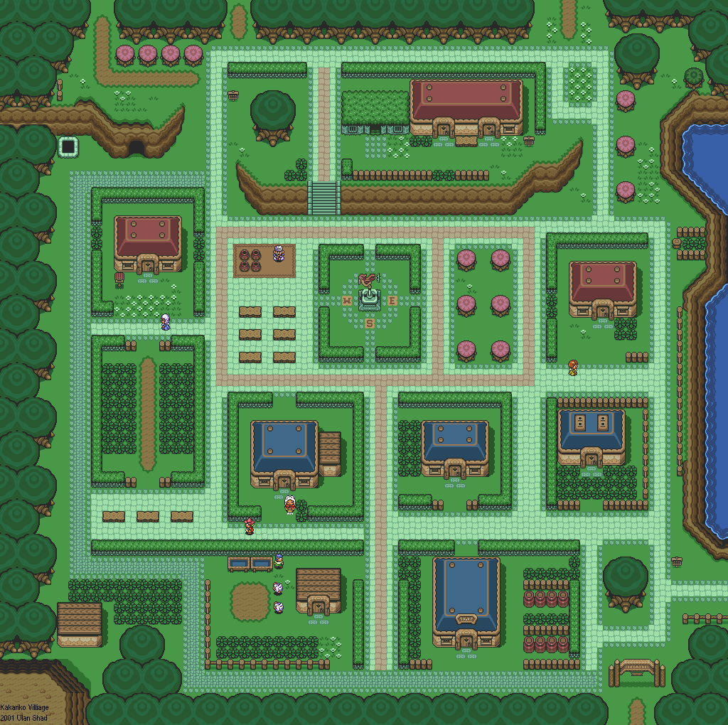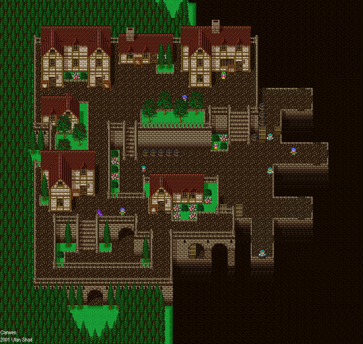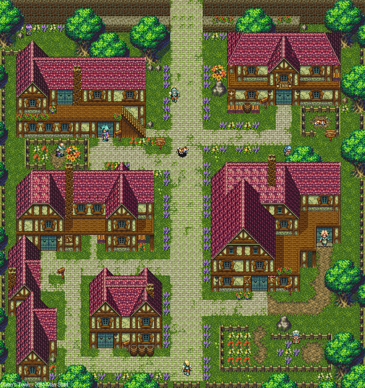 I've tried making other maps from other games. First I did a few from Final Fantasy 3/6, South Figaro and Figaro Castle. Then I got the *bright* idea to do all the maps from EarthBound, well, all I can say is that those maps are HUGE. I got about half done with Onett, and it was about 8000x12000 pixels, needless to say, i gave up on THAT. The maps for Terranigma are i must say MUCH EASIER, mainly because 1. they're much smaller, 2. they have alot of NICE STRAIGHT LINES AND RIGHT ANGLES. The hard part is taking Ark out of every photo. Sure i could just turn off the sprites, but i wanted the villagers in there, for character.