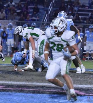![]() Warrior Roland Pina #28 runs for big yardage against South Bakersfield Friday night (Oct. 31) in Bakersfield. The Warriors defeated South Bakersfield 26-7. Tehachapi (6-4; 3-1) will now enter the CIF playoffs and will play Garces in the first round this Friday, Nov. 7. Game time is 7:00 pm. (Photo by Jolene Jones.) .
