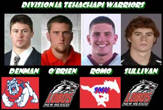 Former Warriors Chris Denman, Jon O'Brien, Jerad Romo, and Johnny Sullivan were named to the All-Tehachapi News 2000-2005 football team. The four players eventually played at Division I schools.