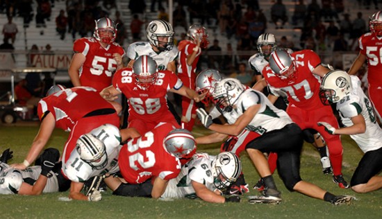 in Bakersfield last Friday night. Above Adam Bullard (11), Kiefer Fincher (66) and Cory Lange (4) stuff a run at the