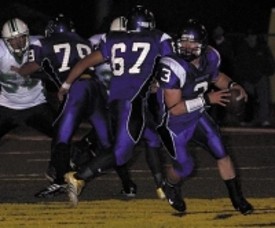 Righetti QB Adam Wilson looks for an open receiver while being protected by linemen Emanuel Meraz (79) and Steven Alurac (67) in Righetti's 15-12 non-league victory over Tehachapi on Friday night. Photo by Ed Souza, The Santa Maria Times.