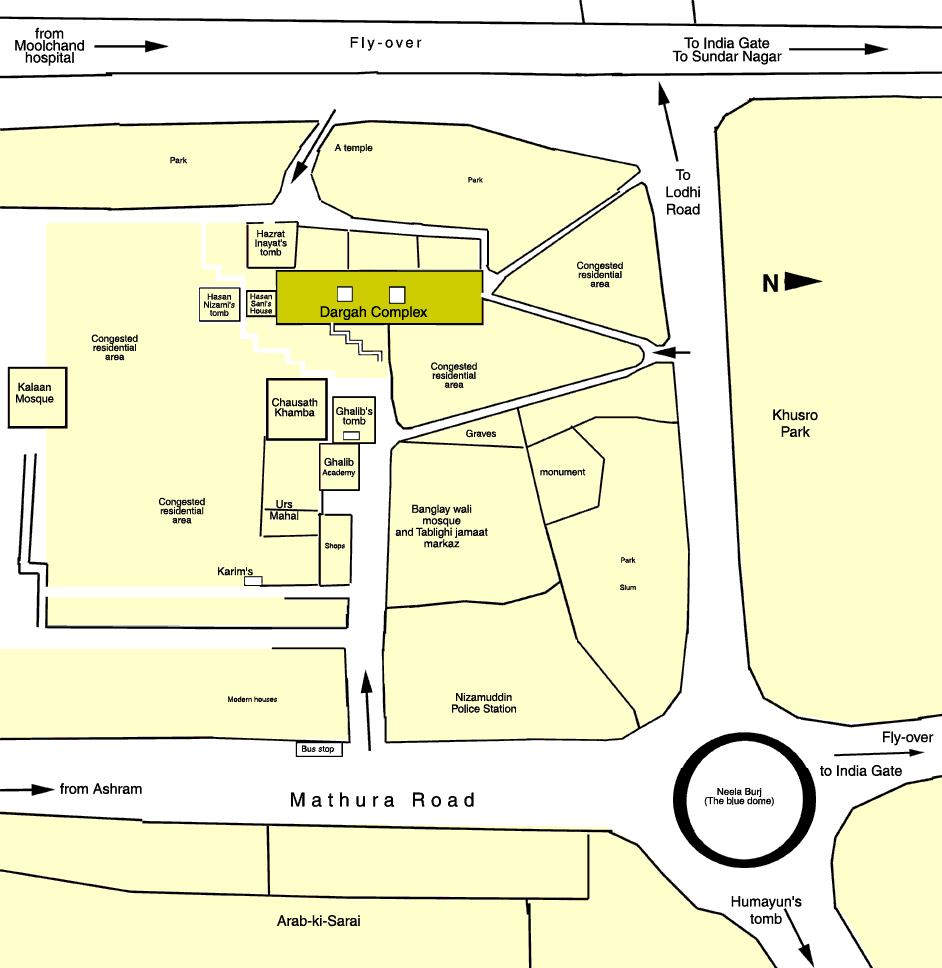 Maps of the Dargah Nizamuddin area in New Delhi (The following maps are not the official versions. Nor are they very accurate in measurements or proportions. They are produced here as a general guideline for those visiting the area of Nizamuddin. Click on them to see the larger versions.)