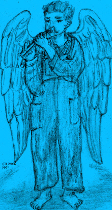 Scene 1. Opening music is given by angel's flute or autoharp. For the first time, it has some definitely melancholy but sweet strains in the music. The tempo picks up at last, then abruptly cuts off.