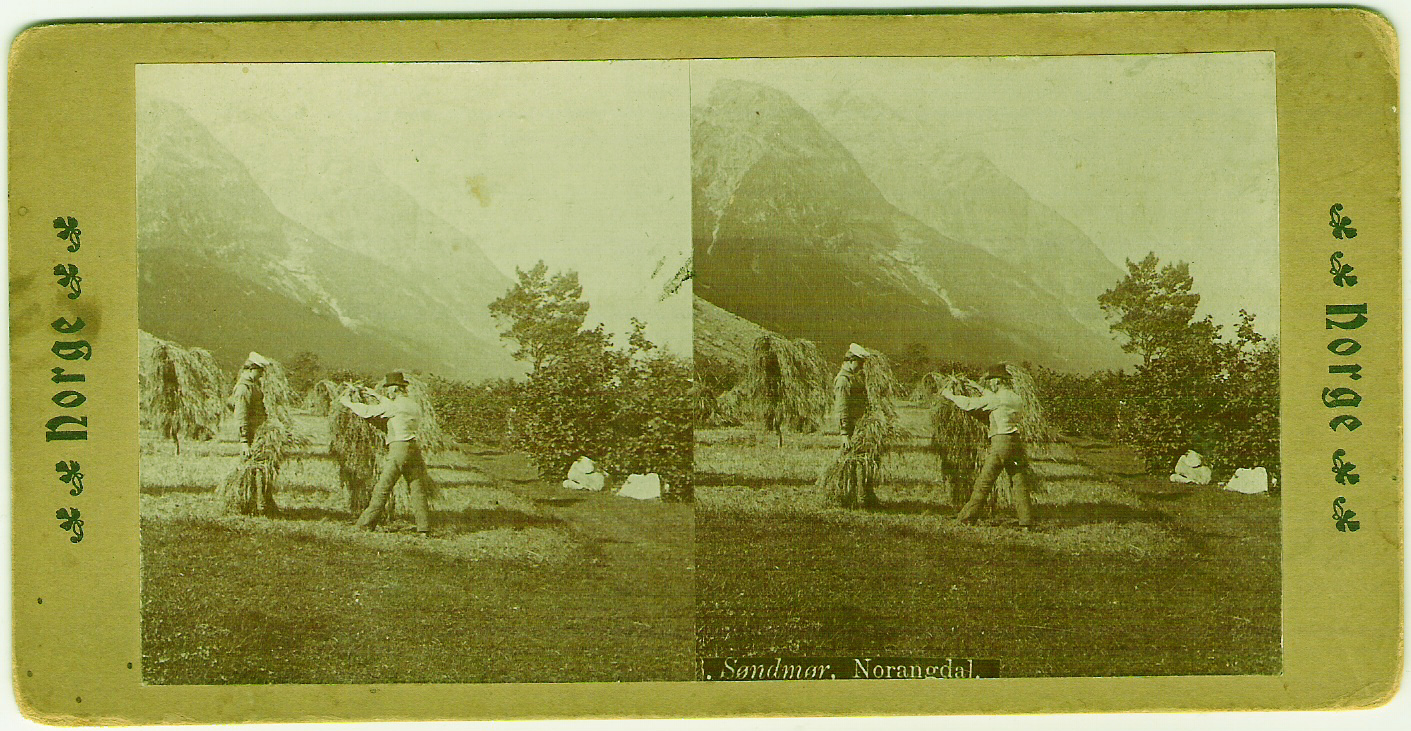 Note: Stereoscopic Pictures, Stereoscope, and Norwegian Flag Pillow Cover, compliments of Pearl A. Ginther, and Stadem Genealogy Book, compliments of Barbara Benson. Also, don't rock too hard, that will help keep the stereoscope more steady for viewing, and so, while we think of it, put a right-leaning slash through both o's in "Sondmor". And in case you haven't figured it out, they're "shocking" or gathering into sheaves (small, upright stacks) the grain in Sondmor, amidst some rather spectacular stage props (these pictures may have been composed in a studio of downtown Oslo?).