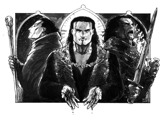 THE LASOMBRA- Masters of shadow and leaders of the Sabbat, the Lasombra are subtle manipulators that can control the stuff of night itself. Their powers over shadow make them feared, and their success in destroying their clan founder had given them the respect of the clans. There are dark rumours to the Lasombra, however. Organized infernalism in the clan is one of many dark suspicions, and no one knows which Lasombra might be one of the infernal Angelus Ater. The few Lasombra who have joined the Camarilla are considered Antitribu, but maintain strong loyalties to the old precepts of the clan and its long dead founder. Lasombras are the Kindred that lack a reflection. Mirrors, black & white photography (and video) and reflective surfaces show no trace of a Lasombra. In addition, due to their taste for the shadows, sunlight is more harmful to them than other Kindred.