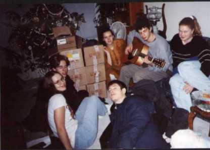 this picture was taken on the day that sarah's cd's arrived. (notice them piled high in the bkrd) just after a hoja show at the mall. everyone was in giddy spirits! ltor: sarah, sarah's bf robbie, sarah's ex bf chris, sarah's sis amy, sarah's bestfriend aaron, and sarah's old smalltownmate jamie.