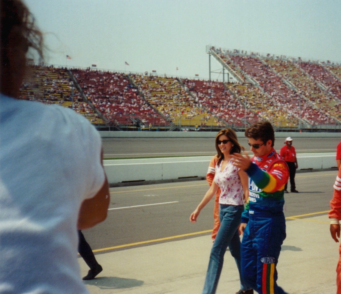 This picture was taken June 12, at Michigan Speedway, right before Jeff qualified, and took the pole position. I am standing in the white, on pit wall, and Jeff is waving me over the wall to get his autograph. I jumped the wall, and he signed my hat. It was the highlight of the day of course. I ended up with about 20 signatures that day, and lots of great pictures.