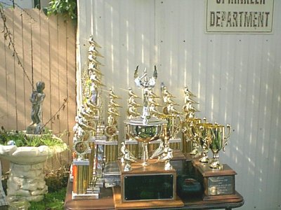11/3/01 the I.C.R.C had our yearly club show. We all thought it would be cold, and the sky would be full of fog. But today was bright and sunny. Not a cloud in the sky, a prefix day for a show. Each member could bring one bird per class to show and try to win the trophies on the right. |