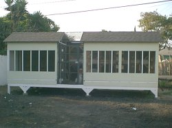 | I've known Barnet for some years now. I think every one with roller pigeons in Los Angeles knows Burnett. His cages are some of the best I've seen. There are two kit box's on this side and when you go to the other side there are two more. Big and roomy with twenty four perches in each box. | ||