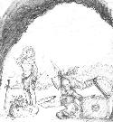 This is a picture of two adventurers: an elfbabe and a dwarf, who is dividing up the treasure guarded by the dead dragon in the background.