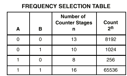 En fonction de A et B, la fréquence initiale est divisée par 28, 2 10, 2 13 , ou 2 16 ce qui autorise une vitesse rapide pour les opérations de pointage. Et on obtient facilement nos 4Hz=30000/2^13 en sortie pour la vitesse de base.