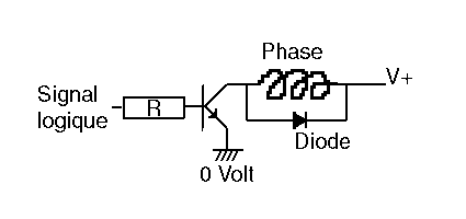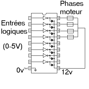Compte tenu de la résistance assez faible des bobinages du moteur pas à pas (quelques Ohms a quelques dizaines d’Ohms), le courant à fournir est beaucoup plus important que ce que peut débiter notre circuit de pilotage logique.