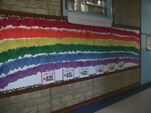 rainbow bulletin board with 2000 hands. Four first grade classes traced