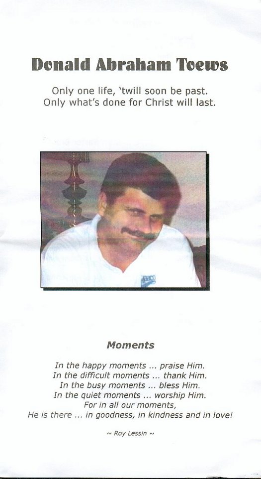 On Saturday, January 3, 2004 Indian Head Fire and Rescue lost a very respected member. Don Toews passed away suddenly at home. Don was a veteran of our department and had achieved his Saskatchewan Level II Firefighter. He was President of the Indian Head Firefighter's Association and one of his great interests was Public Education through the school children. He could often be seen on calls as Pump Operator of our big red truck!