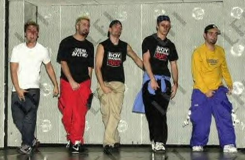 Chris: *sigh* Oh, Chris. Why must you be the one really inhibited, very self-conscious grabber out of the whole group? Chris definitely isn't comfortable with lewd public displays like this. See the 'floor-humping' scene in the "Pop" video.