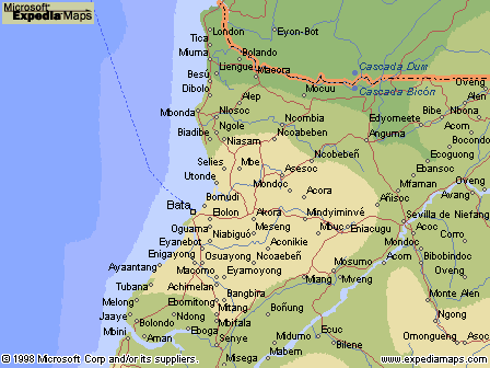 Isla de Bioko: Llamada de Fernando Poo durante la colonización española, en honor del navegante portugués que la descubrió. Se halla en el fondo del golfo de Guinea, en la bahía de Biafra, a 33 kilómetros de la costa del continente africano, frente a la costa de Camerún. Es la mayor y más bonita isla del golfo. El aventurero Stanley, la llamó "perla del atlantico".