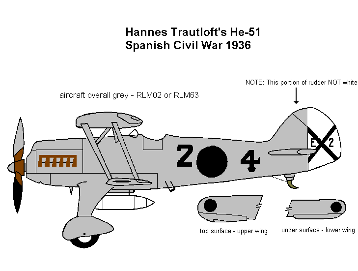 The drawing of Hannes Trautloft's He-51 that he flew during the summer of 1936, is based on a photograph of one of the early He-51s sent to Spain displaying the coding 2-4 (page 16). Only the port side is shown. It is assumed that the same markings are applied to the starboard side of the aircraft.