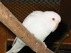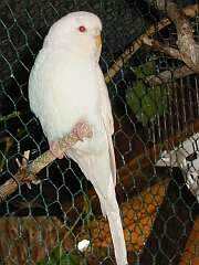 Aparición: 1931 Austria Arriba Izquierda : Albino Se trata del blanco de ojos rojos que apareció por primera vez en Austria en 1931. Los periquitos albinos presentan un color blanco inmaculado, patas rosas, ojos rojizos y un pico amarillento y pálido. Los machos adultos poseen ceras moradas, mas que azuladas; las hembras poseen ceras marrones. Los albinos de exhibición son menos frecuentes que el lutino , que resulta dominante en términos de herencia cuando estas dos mutaciones son apareadas. Es deseable que el periquito albino presente en el plumaje el mínimo rastro de azul posible. Es posible obtener Albinos de Rostro amarillo y de Ala de Encaje.