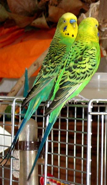 Comparación: Nótese la diferencia entre un periquito normal y un opalino en las marcas de las alas. La mutación opalino afecta también la coloración corporal dándole una tonalidad más apenas mas ligera y brillante que la coloración normal. Izquierda: Verde Claro Normal Derecha: Opalino Verde claro.