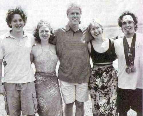 What, you might ask, is Olympic speed skater APOLO OHNO doing hanging with THE CLINTONS? And why is he wearing his gold medals at the beach? Reasonable questions, and ones for which there are in fact answers. For its July issue, W magazine brought Ohno to the Domincan Republic where, serendipitously, the Clintons and Chelsea's boyfriend IAN KLAUS happened to be on vacation. When W asked them to pose together, the Clintons eagerly agreed. "They were in awe of Apolo, treaing him like a celebrity," says W fashion director Joe Zee. In return, Ohno apparently made no snide comment about Bill's shirt.
