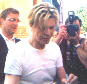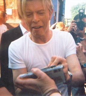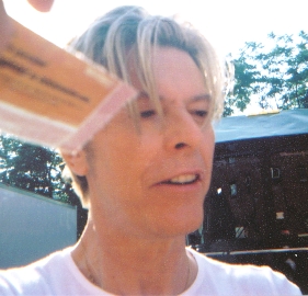 About 2 hours before the show, Bowie emerged to sign some autographs for his loving fans. Amanda ran to his left as I, the near-to-puking Tara, meekly shivered to his right. Bowie approached Amanda and CONVERSED WITH HER!! I hear it went like this: