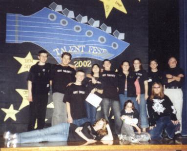 There was a contest in my school to make a logo for a talent show called "Talent Fest". Mine was chosen. The picture below are of the giant mural (16' x 11') we made of the logo. I transfered the logo to the mural and the art club helped me paint it...THANKS GUYS, ESPECIALLY LAURA!!! Don't mind the talent fest 2000 shirt in the second picture...the year was actually 2002...but, if you know me, you know that I'm not all for that new fashion.