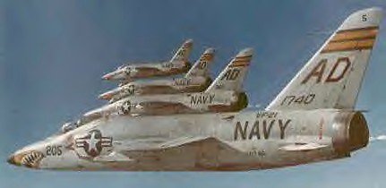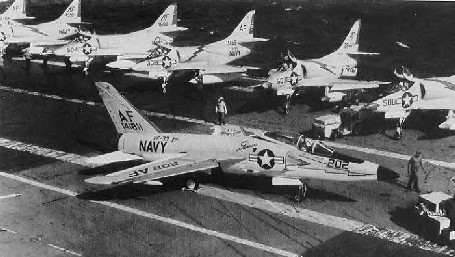 Flight testing at Edwards AFB did turn up some control and stability problems which needed fixing before the aircraft could be declared ready for service. These modifications were incorporated in BuNo 138606, which flew for the first time on December 15, 1954. It had redesigned vertical tail surfaces with a a narrower chord rudder, a boundary layer splitter plate for the air intakes, a clear sliding canopy to improve rearward visibility, and a slightly longer nose. By then, an additional 388 production fighter aircraft had been ordered (BuNos 141728/141980, 143232/143366) and 85 reconnaissance versions (BuNos 140379,140413, 141981/142009, and 143367/143387), and these modifications were to be incorporated. The production aircraft were to be powered by the Wright J65-W-18 turbojet, rated at 7400 lb.s.t. dry and 10,500 lb.s.t. with afterburning. Armament was to be four 20-mm cannon mounted in the lower edges of the air intakes. In addition, four Sidewinder infrared-homing air-to-air missiles or two Sidewinders and two 150-US gallon drop tanks could be carried on underwing racks. In accordance with the new Navy requirement for inflight refuelling capability in all its combat aircraft, a partially-retractable refuelling probe was added in the nose.