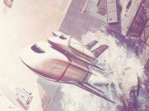 The huge wing tanks (which carried 54,011kg of LH2) had the effect of increasing the orbiter’s “propellant fraction”, in other words the shuttle’s empty weight would be less despite carrying more propellant at liftoff. Not only did this produce a smaller and less expensive orbiter, it also enabled Boeing to simplify the booster as well. The system would now stage at a lower velocity (2123 meters/sec.) than the fully reusable Phase-B design’s 3000m/s. As a result, the booster would have to carry less rocket propellant for ascent and 50% less jet fuel for its flight back to the launch site. The lower staging velocity also meant the booster’s thermal protection system could be simplified and Boeing settled for a simple aircraft-like “heat sink” design much like the old X-15’s. The total gross liftoff weight was reduced by 590t compared with the Phase-B baseline shuttle, and it was expected that the marginal cost per flight would stay the same since the additional cost of the fuel tanks would be offset by the reduction in complexity & size (e.g. smaller engines to refurbish between flights). The Grumman orbiter version depicted here has three small engines unlike the NAR & McDAC Phase-B designs. Grumman decided that three 1,845.75-kilonewton thrust engines rather than two 2.45KN-thrust motors would act as a safeguard against engine failure. The Phase-B design had no such problems since it would stage at a higher velocity and still could make it to orbit despite the failure of a single engine.