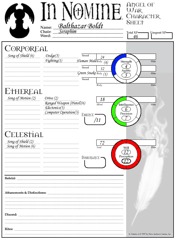During 2002 I played in one long-term game, "In Nomine", run by Gareth Cranefield. I played a Seraphim of Jean. Our usual mission was information gathering and