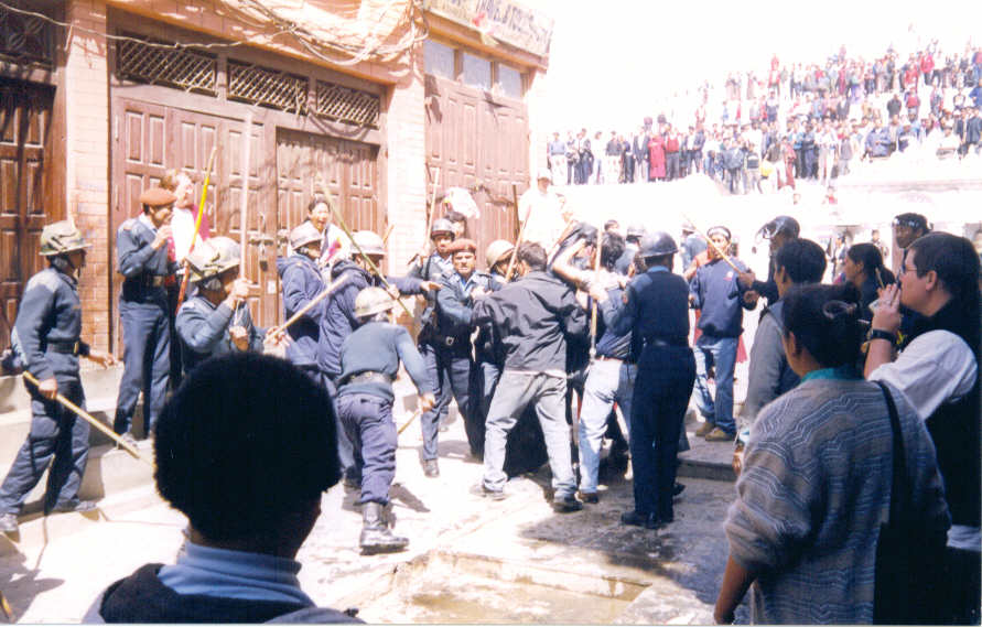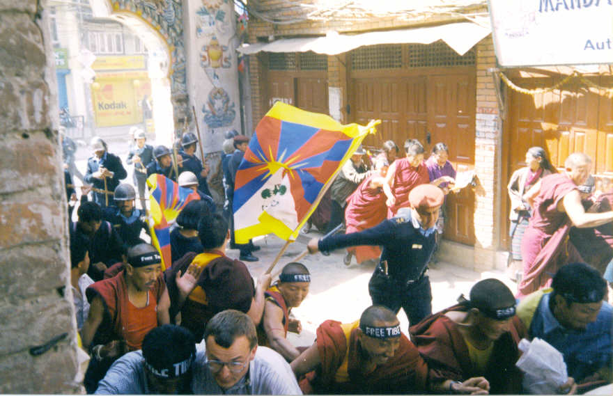 It was a scheduled protest. It happens every year. School bands were even there. This year the Tibetan's were particularly empowered due to the escape of the Karmapa only two months before. Unfortunately this made the Chinese even more adamant about exercising influence over Nepal to crack down on the Tibetans. The protest started to move away from the stupa area and there was talk about marching to the Chinese embassy. They attempted to get past the gates of Boudha and than all hell broke loose...