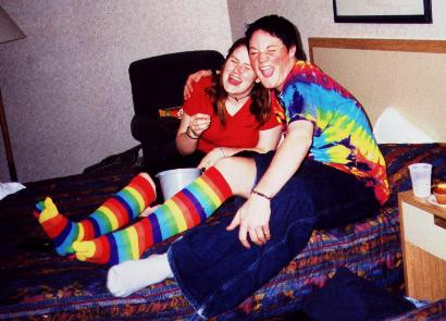 "At 7:00: UFOs. At 8:00: MOFOs. At 9:00: UFOs and MOFOs: when Homies and Aliens collide. And at 10: chris and kelly sitting on a bed eating hotel ice and trying on my toe-socks"