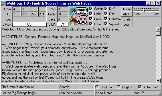 WebHogs evaluates web pages and rates them with a Pig Score. The Web Hogs themselves are the web pages with the greatest Pig Scores. WebHogs produces Pig Scores for indiviual web pages, a list of sites in an input file, or will go out and find them all by itself ("deep surf troll"). The greatest Web Hogs may then be listed in the Web Page Pen -- the Web Hogs Hall of Shame.