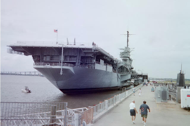 | This picture gives one an idea of the size of the Aircraft carrier. Also visible in the right hand corner is the Periscope of one of the WW-II retired submarine kept on display at Patriots Point | ||