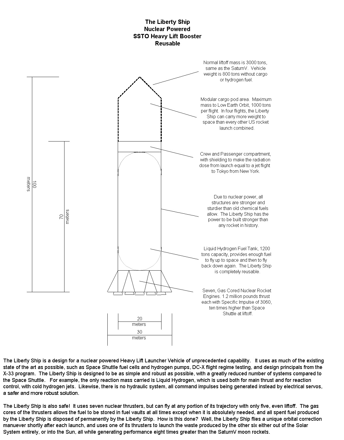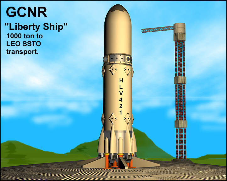 The Liberty Ship is a design for a powerful nuclear powered booster, designed for maximum safety while effectively harnessing the incredible power of nuclear reactions. Before we can do anything else in space, we MUST be able to get to orbit. The Liberty Ship is meant to address that fact. The wonderful image here of the Liberty Ship is made by nukepulse, from the nuclearspace.com web forum. He's awesome! For more info, try the links below, they have plenty of text of some basics of the Liberty Ship. Plus, this site is being developed as of 2003. Check back and see how we are doing in our attempt to leave the cradle of mankind!