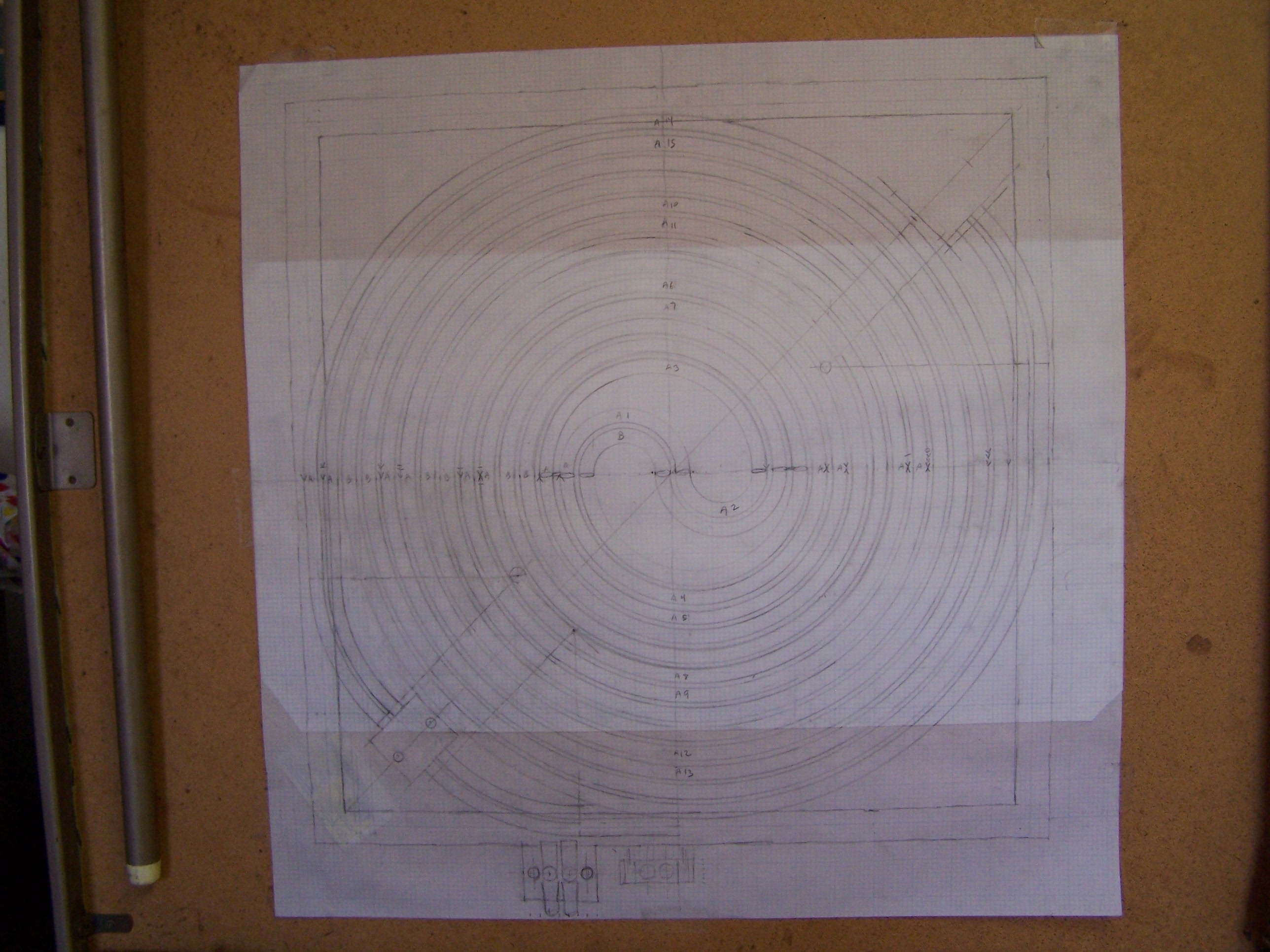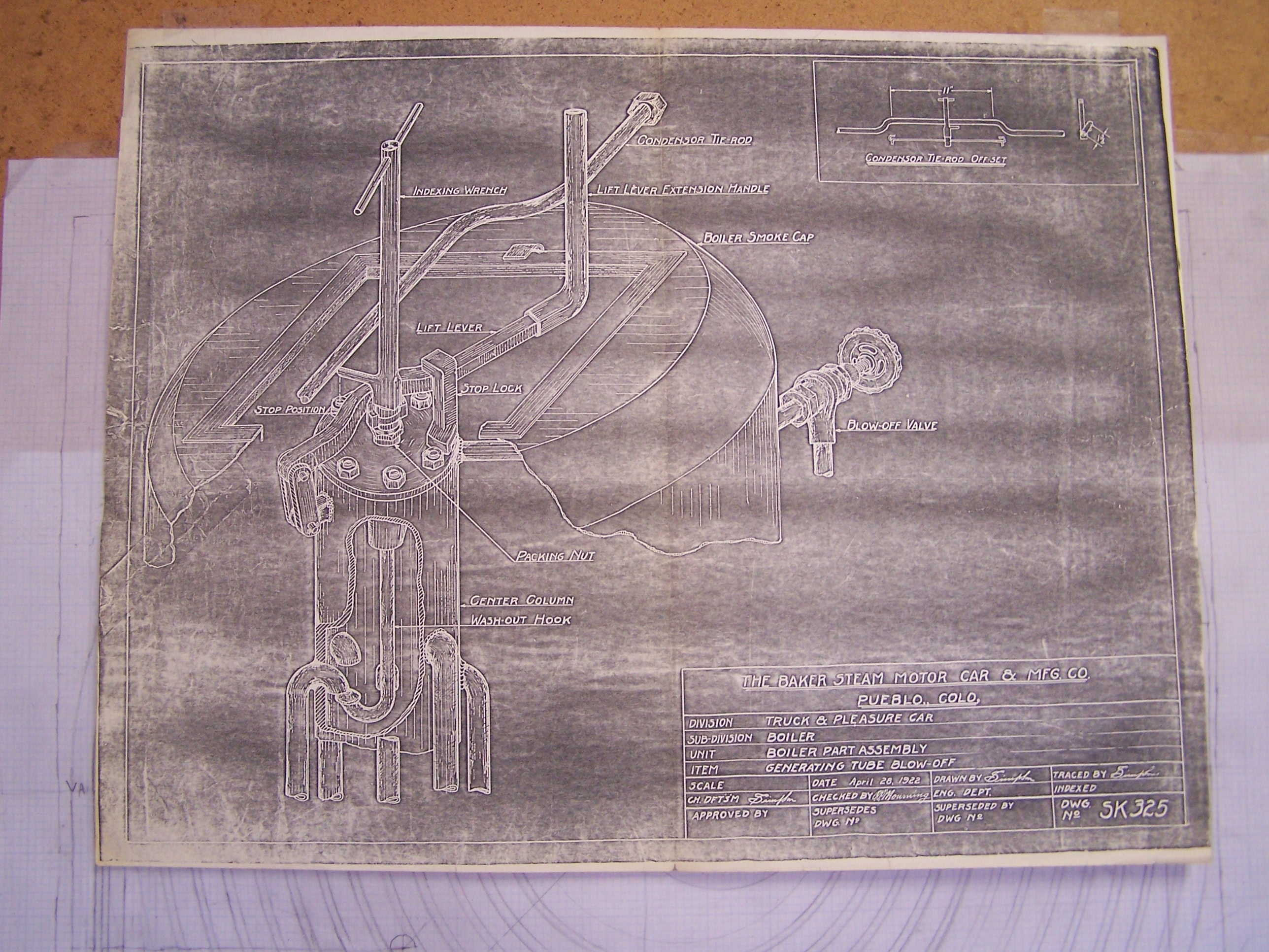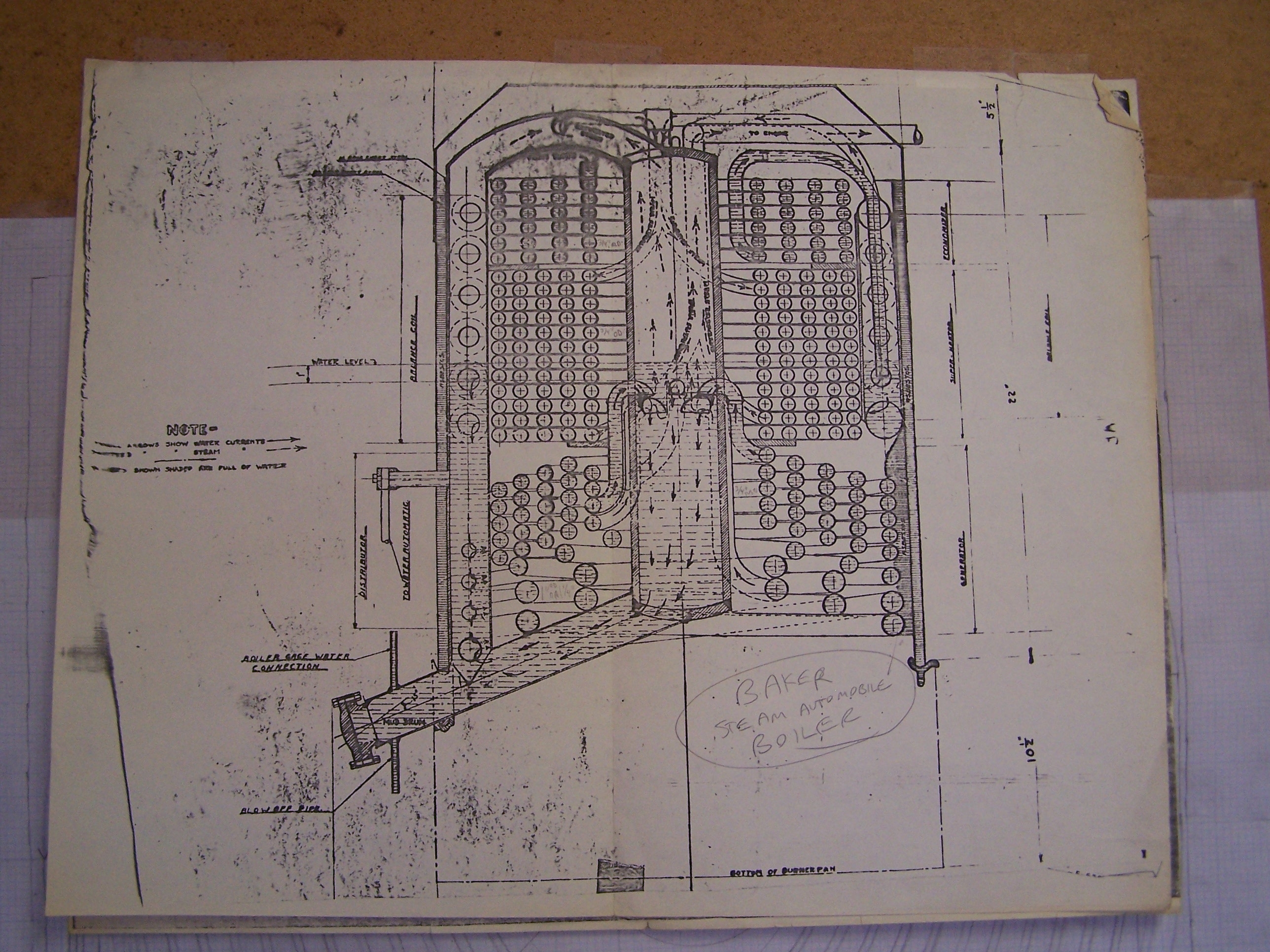 This is not part of the Baker boiler, and the drawing is a bit fuzzy, but I figured I'd throw this in while the camera was handy. This is a layout drawing of the economizer coil for my new/improved "M2012" rapid-natural-circulation boiler. 6 of these 2-path pancake coil units will be stacked up above the firebox/steam-generator section of the boiler. The economizer is the part of a boiler which removes the last bit of practically-recoverable heat from the burner gases, heating the incoming feed-water in the process, before exhausting the cooled gases from the boiler. Note the 2 squares drawn under the tube coil. The innermost square represents the edge of an infrared-reflecting baffle between the firebox and the economizer above it. The firebox is lined with a "waterwall" of vertical steel tubes, in which water circulates rapidly upward as radiant heat from the fire boils the water in the tubes. At full steam output, a minimum of 10 lbs of water circulates for every one lb of steam generated. As in standard natural-circulation water-tube boilers, no pumps, eductors, or other extra devices are required to initiate or maintain this rapid circulation. About half of the heat in the fuel is turned directly into steam at that stage. The exhaust gases from the firebox flow up to the economizer through the gap between the edge of baffle and the inner wall of the boiler [represented by the outer square], and almost no radiant heat reaches the economizer tubing. There will be other baffling, not shown in this drawing, which directs the hot gases through the gaps between the turns of the tubing, flowing over each of the 6 coils in succession. This economizer will have vertical gas up-flow and vertical water down-flow, rather than the horizontal inward/outward gas/water counterflow of the previously-planned Andy Patterson "1999 donut boiler" style economizer. The previous "donut" economizer was designed for my now-discarded "M2006" boiler design. Unlike the old economizer design, this new design gives complete "blowdown" for cleaning. A clean boiler is a happy boiler.