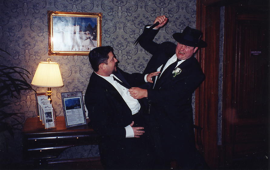 Check out Ed's wild red zoot suit! Here we are standing in the grand Main Lobby of the Stanley Hotel, with the 1906 Stanley steam car directly behind the photographer, and the entrance to the excellent Cascades Restaurant (try the elk!) behind us. To the left is the entrance to the MacGregor Room, where the reception and dance were held. Dig my 1940s-style slicked-down hair. Hey Pops, better change that oil!(Dave Hart photo)
