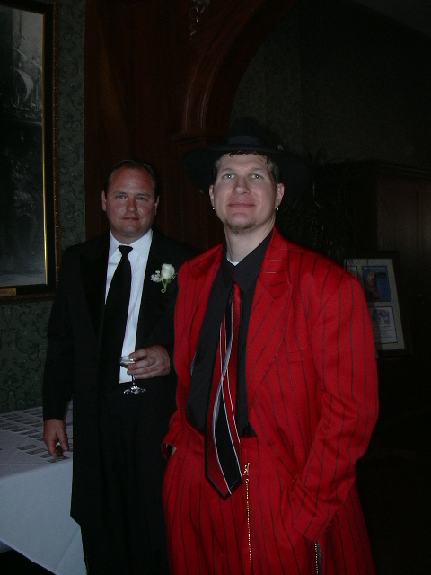 From June 13th, to June 16th, 2003, I stayed at the Stanley Hotel in Estes Park, Colorado for the wedding of my friend Ed Pierce (nee Carter). Ed is a fan of swing music and swing dancing, so all the guys in the wedding party, including me, wore 1940s zoot suits. The wedding ceremony was held in front of the Hotel, with the swinging reception afterwards in the Hotel's MacGregor Ballroom.