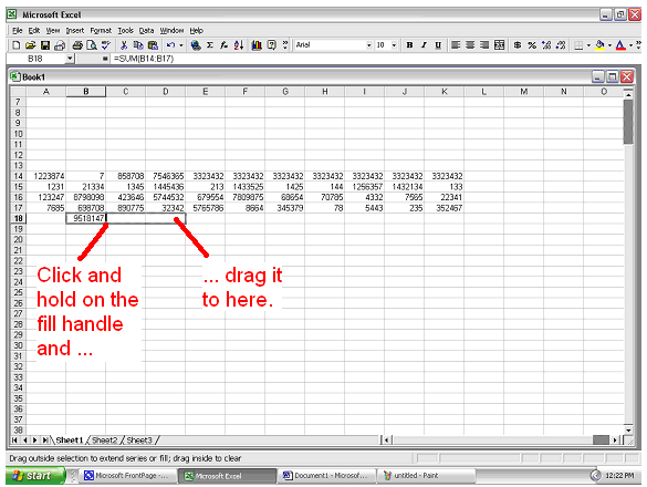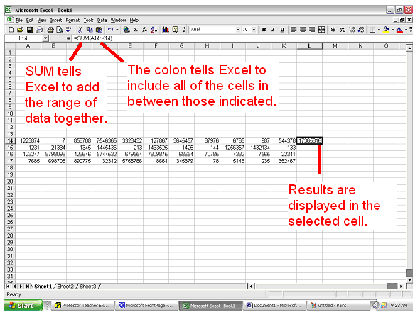SUM tells Excel to add the numbers from the cells in the brackets. By typing a colon (:) between the cell references you are telling excel to include all of the cells between these cell references.