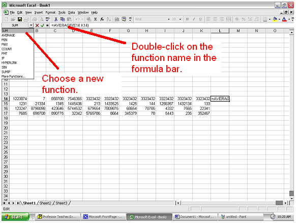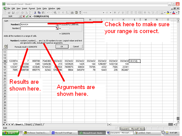 Functions are more powerful than simple formulas. For instance if you wanted to add a range of numbers such as cells A14 through K14 you would have to type =A14+B14+C14...+K14. To do this more simply you could use a function =SUM(A14:K14), this would tell Excel to sum all of the data from cells A14 through K14.