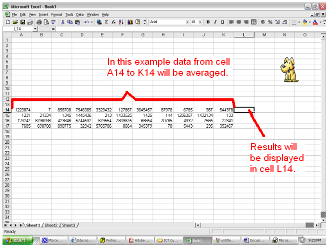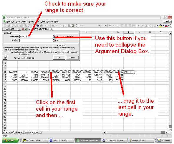 AVERAGE tells Excel to average the numbers from the cells in the brackets. By typing a colon (:) between the cell references you are telling excel to include all of the cells between these cell references.