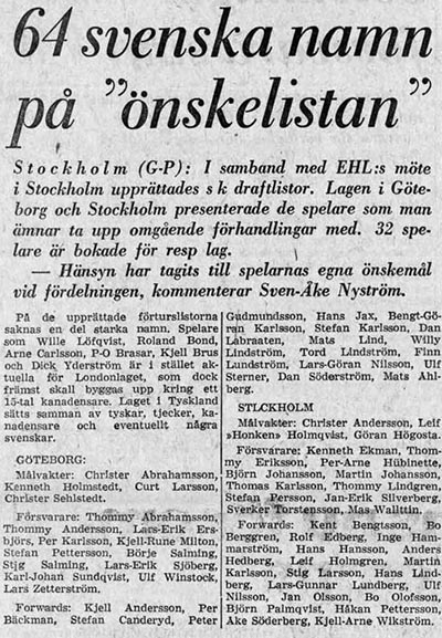 ![]() Mikko Westerberg ![]() Aimo Mäkinen ![]() Göran Stubb ![]() Arne Strömberg and Ed Reigle ![]() Bror Mellberg ![]() Kjell Svensson ![]() Lars Laestadius ![]() The wishlist of players as presented in Swedish paper Göteborgs-posten 19 May 1973 |