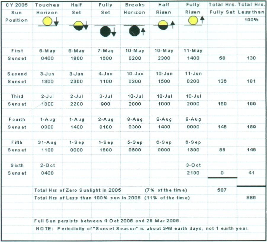 thus makes it a very attractive site for lunar base activities. Table 1 lists the projected sunset / sunrise
