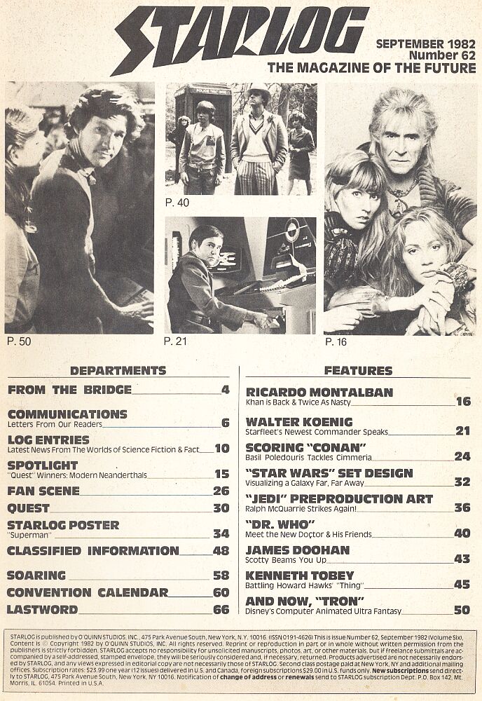 Most of the things on this page are scanned out of copies of Starlog and the lot from the actual time of the movie--1982. Therefore, I apologise for any fadedness, bent page corners, etc...these things really are QUITE old. I mean, for magazines that had been moved around from household to household, tossed on various shelves and actually _read_. If they had been preserved, sure, but we're not the collector type of sci-fi fans, at this house. We get stuff to _use_ it.