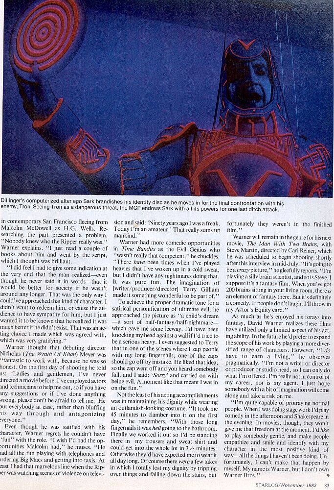 First page of a nice interview with everybody's favourite baddie...David Warner! And yes, they do mention "Tron". A lot. Including with pictures. This is from the exact same issue of the magazine. (They also talk about "The Evil Genius" and Jack the Ripper from "Time After Time", which are two of my other personal favourites of his roles.)